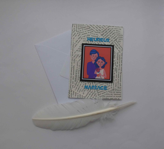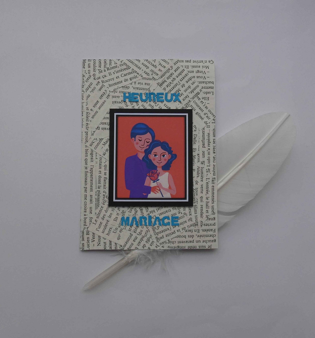 Un mariage est un moment important dans la vie. Voici une carte de vœux unique faite à la main à offrir à deux personnes qui vont s'unir ou qui se sont unis récemment afin de les féliciter. Les mots qui tournoi tout autour de la carte symbolisent à la fois l'histoire qu'ils ont déjà écrit et et toutes celles qu'il reste à écrire.