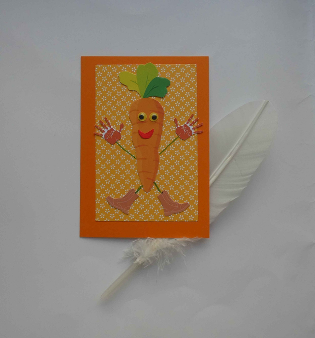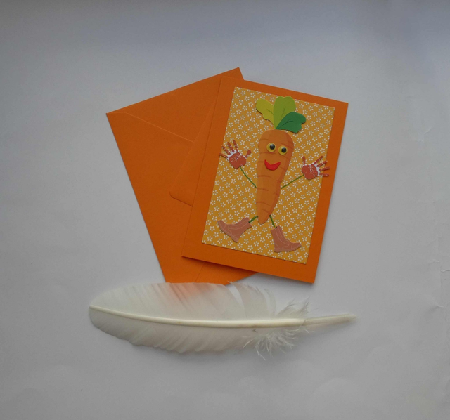 Envie d'apporter de la joie à la personne à qui tu vas écrire ? Alors cette carte de vœux unique et artisanale est faite pour toi, car la bonne humeur de cette carotte est contagieuse.